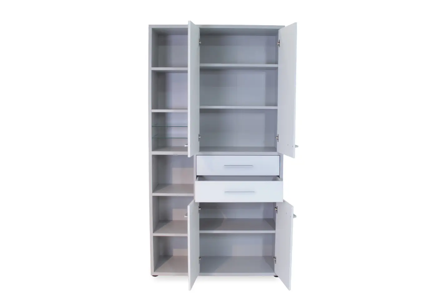 Der vielseitige Aktenschrank Mogelsberg in elegantem Platingrau mit Weissglasfronten vereint modernen Stil und durchdachte Funktionalität auf beeindruckende Weise. Mit sechs Ordnerhöhen, offenen Fächern und integrierten Schubladen bietet er großzügigen Stauraum und beste Organisation für Akten, Dokumente und Büromaterial. Die hochwertigen Aluminiumgriffe und die edlen Glasfronten verleihen dem Schrank eine moderne und elegante Ausstrahlung, die sich harmonisch in jedes Büro oder Homeoffice einfügt. Exklusiv bei Delta Möbel in Haag findest du diesen hochwertigen Büroschrank, der Funktionalität und Design perfekt kombiniert.