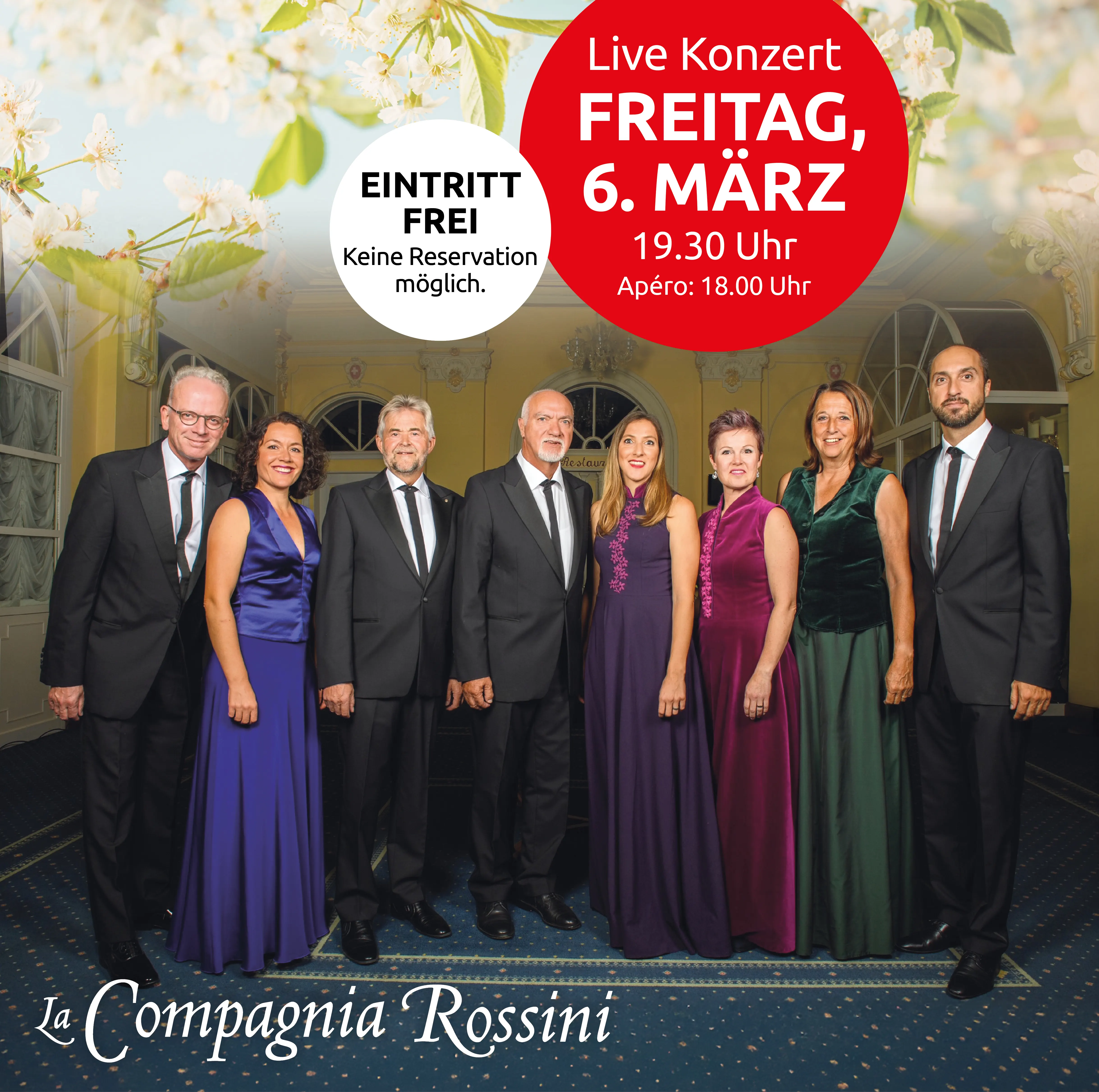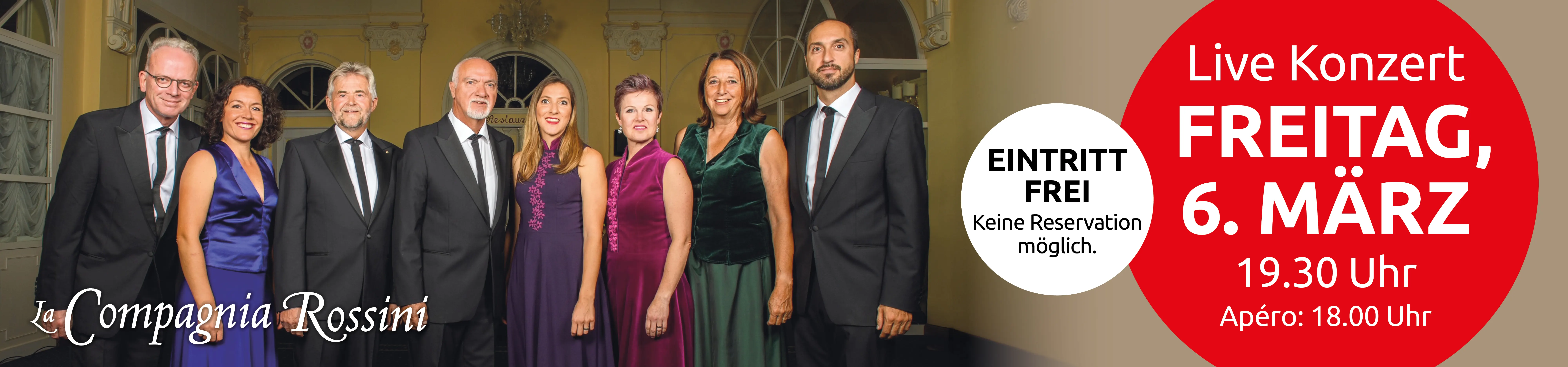 Freuen Sie sich auf La Compagnia Rossini mit klassischer Musik voller Ausdruckskraft und Leidenschaft. Das Bündner Solistenensemble begeistert mit stimmungsvollen Stimmen, schönen Melodien und einem Konzerterlebnis, das einfach Freude macht. Der Eintritt ist frei. Apéro ab 18.00 Uhr, Konzertbeginn um 19.30 Uhr.